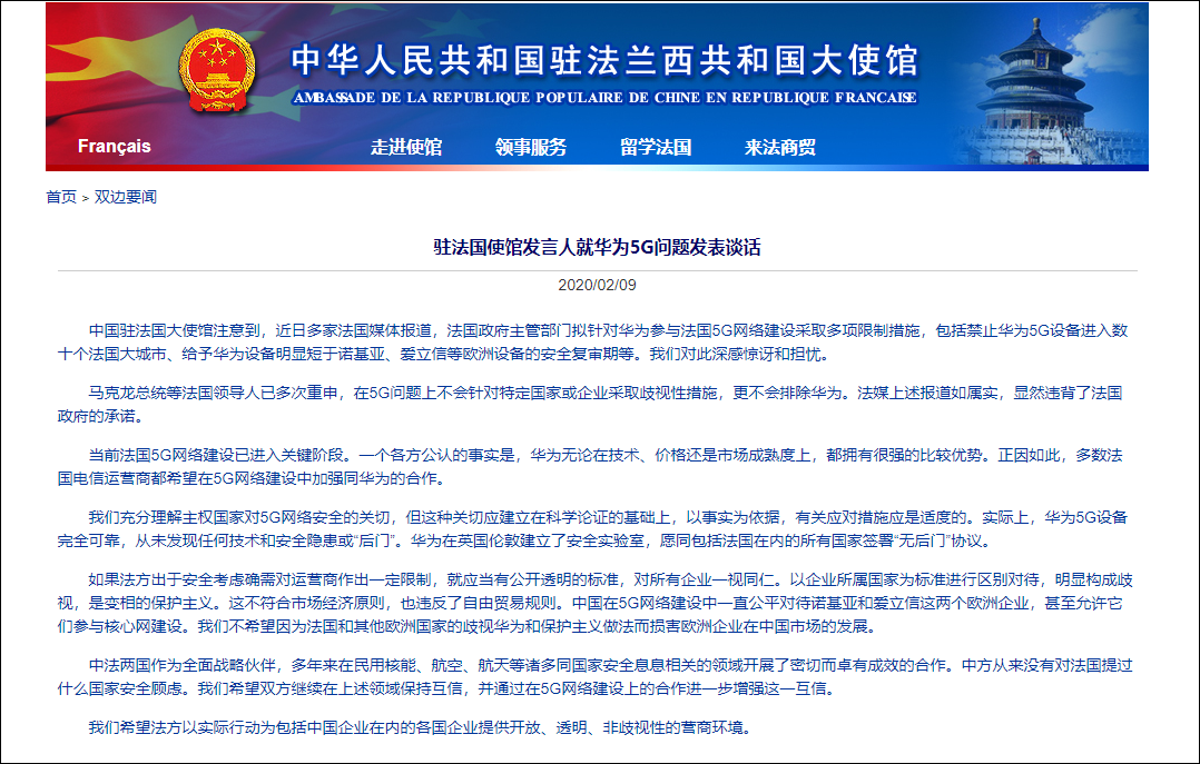 大使馆表示,马克龙总统等法国领导人已多次重申,在5G问题上不会针对特定国家或企业采取歧视性措施,更不会排除华为。法媒上述报道如属实,显然违背了法国政府的承诺。