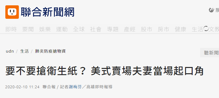 报道称,今早岛内一间美式卖场一开门,尽管卖场已限定每人只能买一提,但很多人仍“直冲”卫生纸区。期间,一对夫妻还为了是否要买卫生纸当场发生口角,先生认为不必囤货,卫生纸是便宜的用品,太太却担心将来可能会因原物料短缺而涨价,坚持要买。两人意见不合,先生气得先离开卫生纸区,太太则拿走一提卫生纸放进购物车。