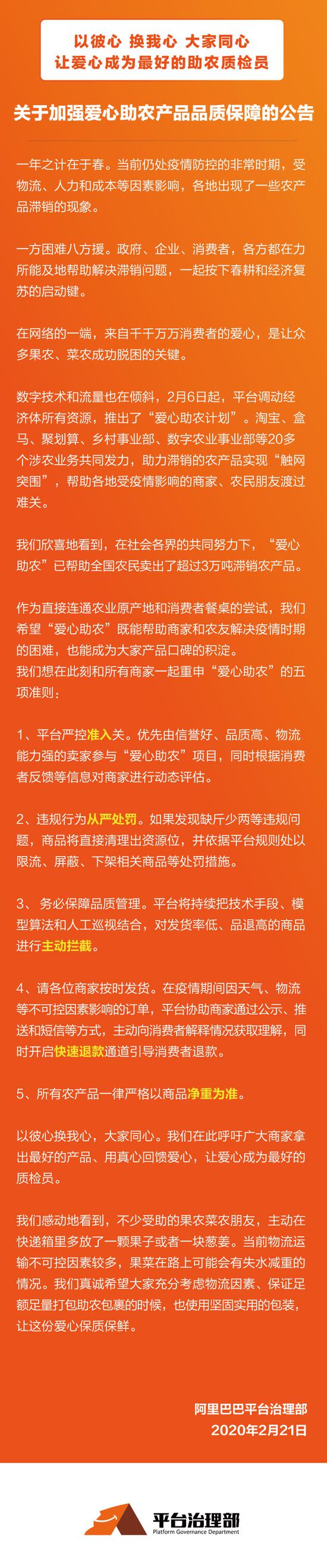 科技讯 2月21日晚间消息,阿里巴巴集团向平台商家发布公告,强调平台会持续从商家准入、商品抽检和品控等五条“爱心助农”准则入手,严控产品品质关,同时呼吁所有参与“爱心助农”项目的商家拿出最好的产品,用真心回馈广大消费者的爱心。