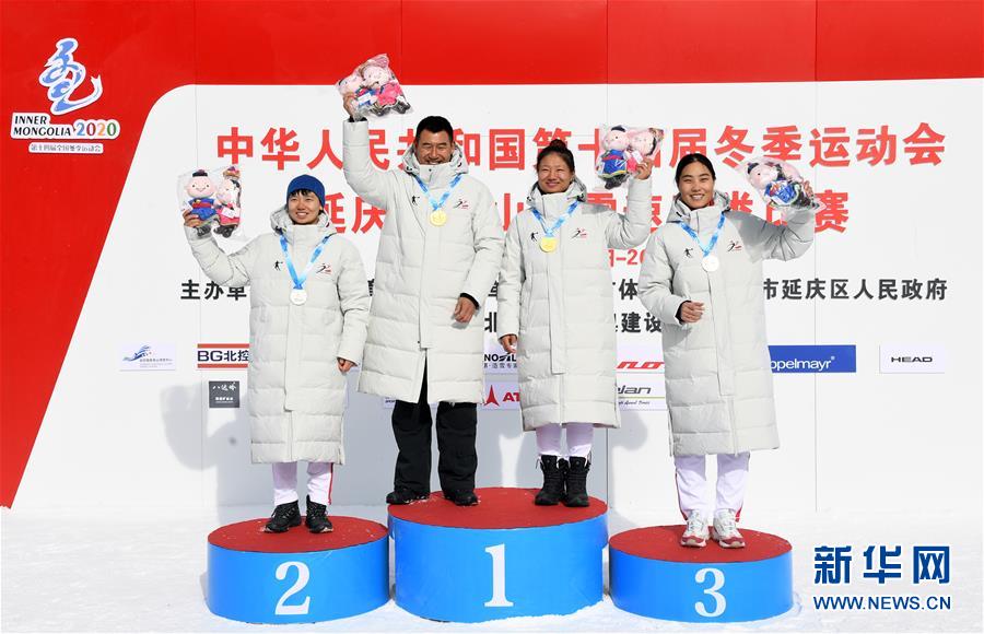 1月16日,冠军黑龙江队选手孔凡影(右二)、亚军黑龙江队选手倪悦名(左一)、季军黑龙江队选手朱天慧(右一)与她们的教练任立刚在女子滑降比赛颁奖仪式上。 当日,第十四届全国冬季运动会高山滑雪速度类项目比赛女子滑降比赛在北京延庆国家高山滑雪中心举行。 新华社发(任超摄)