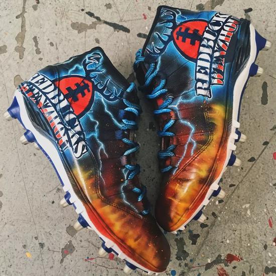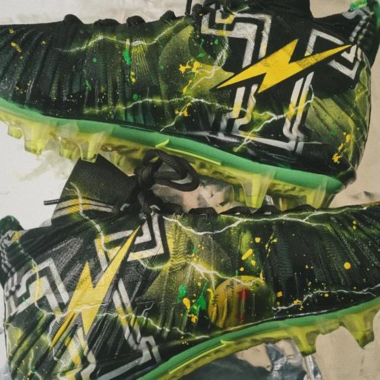 做美式足球比赛用鞋的定制,国内可能真的不多,不过小明的风格的确非常适合。他本来就非常中意美式涂鸦风格,用他自己的话来讲就是 “骚”。所以当他遇到美式足球鞋的定制,自然会碰撞出更多创作的火花。