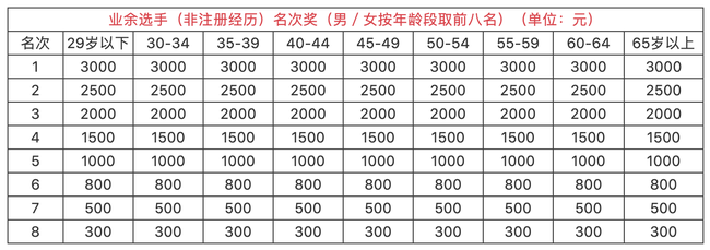 组委会还特别设立了业余选手各年龄组名次奖,业余(非注册经历)选手各年龄组名次奖:按男女各9个年龄段前八名的选手(净成绩),分别获得奖金(人民币,单位:元)