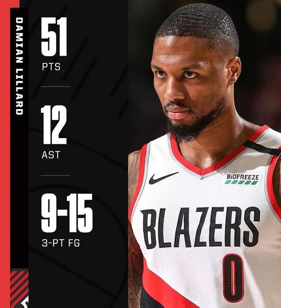 每年全明星前后,总有一个球员要爆发,他就是利拉德。北京时间2月2日,开拓者124比107战胜爵士,轻松取得四连胜。利拉德出战36分钟,29投17中,其中三分球15投9中,狂砍51分,外加12次助攻!