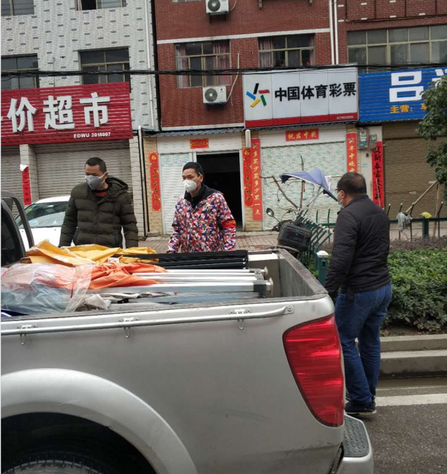 2月7日晚上11点多,武穴办事处发出紧急求助信息,需要帐篷为参与一线工作的志愿者遮风挡雨。何建华知道后,立即联系武穴部分在春节前领用帐篷准备用于春节期间出门销售的体彩业主,逐一落实帐篷。第二天一大早,何建华将收集来的帐篷及时交给社区负责人,较好地解决了这个燃眉之急。