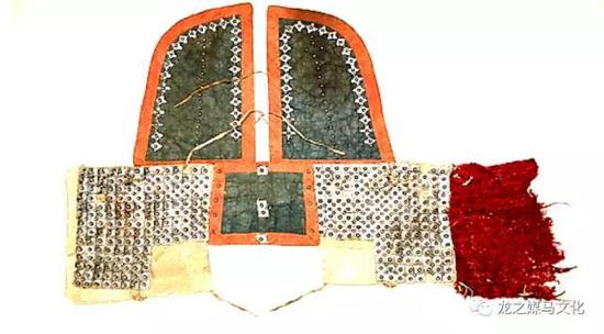 藏族古具装独特的鸟翼形设计是表现在马颈甲上,从现存的古藏族马颈甲可以看到,在扇形颈甲的下方是两块长方形的马背甲,背甲用毛毡做里,中间开叉,面上各镶方形铁片 186 块,铁片之间嵌铁制乳丁 80 个。在背甲的两侧边沿缝有牦牛尾编成的黑穗,牦牛尾的流苏是骑士身份的代表,通常高级军官的马具上才有牦牛尾装饰。整件颈甲平摊时犹如展翅飞翔的鸟,其结构形制与中原地区的具装截然不同。中原地区的具装在车战时期就已经具备,其颈甲都是用大块的长方形甲片编缀而成。这种制作方法到南北朝时期依然基本相同,一系列出土的陶俑、墓室壁画都反映了这种状况图,完全不像藏式马颈甲是由两片鸟翼形板组成的。这种独特的鸟翼形设计体现了藏族马文化的特点——对飞天宝马的崇拜。